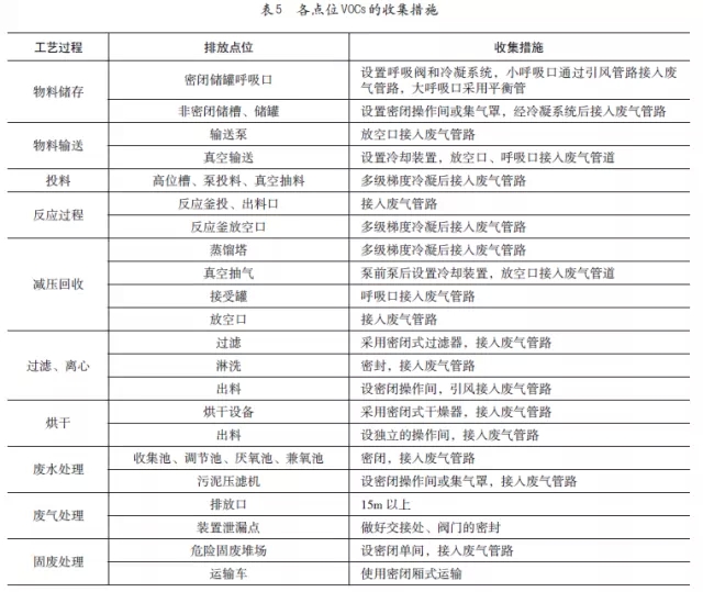 医化企业VOCs的收集是处理的前提,不同的废气排放点位需采用不同的收集方式,将无组织废气转化为有组织废气,并进一步通过预处理回收,不同环节废气收集及预处理措施如表5。